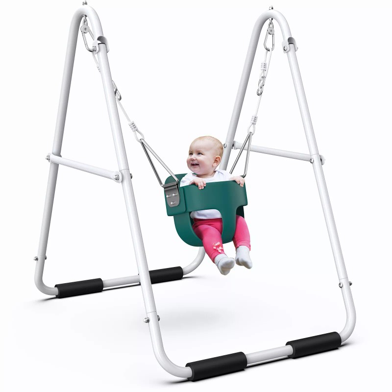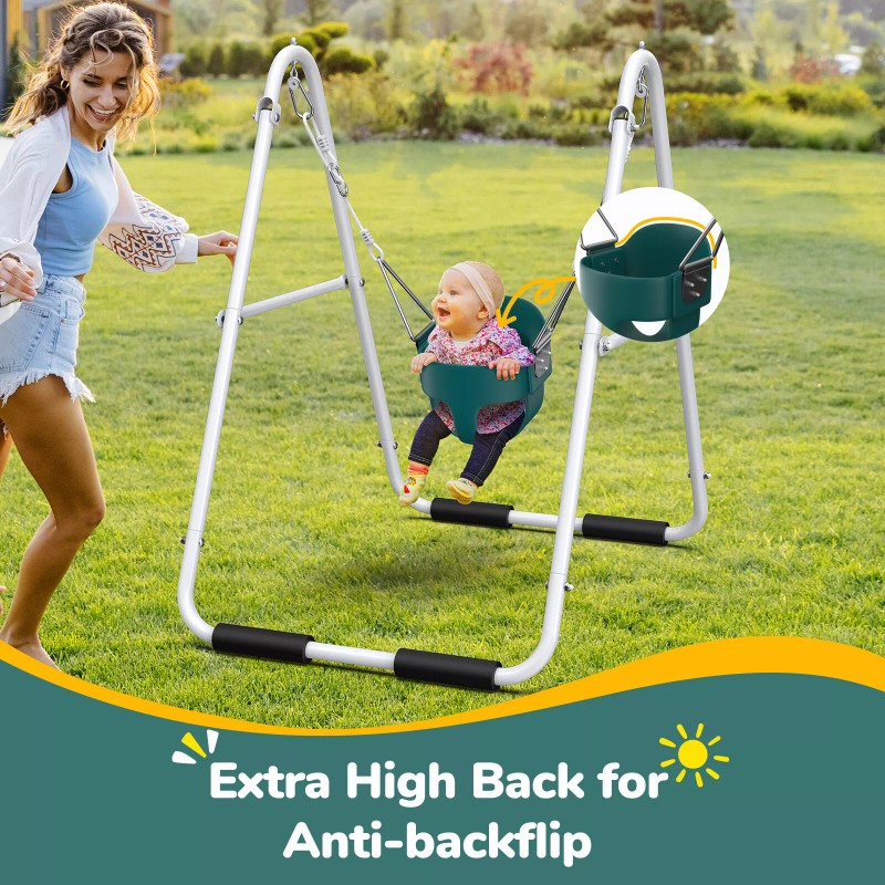 - Upgraded Secure Design: This baby swing stand adopts a sturdy U-shaped and A-frame structure with non-slip feet preventing tipping over. Higher back seat protect kids from backflip. Extra thicker heavy duty metal pipe making it more stable