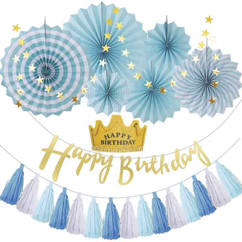 Hapipa Birthday Garland, Happy Birthday Decoration, Popular, Crown Headband, Stylish, Boys, Adult (Blue Paper Fan Set)