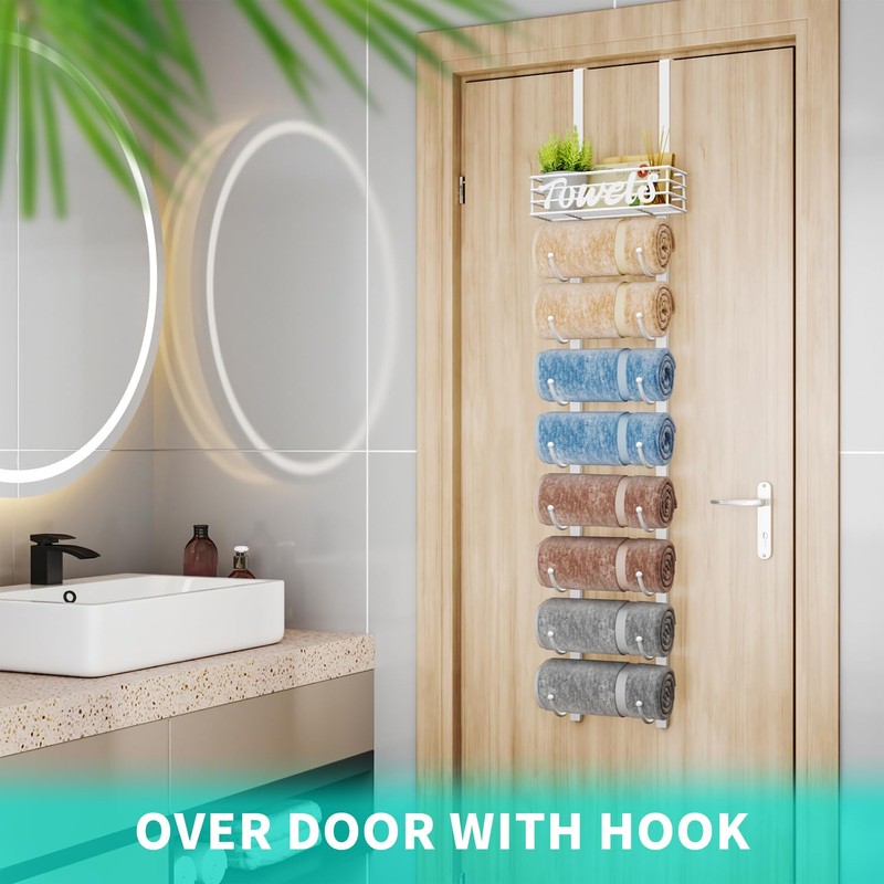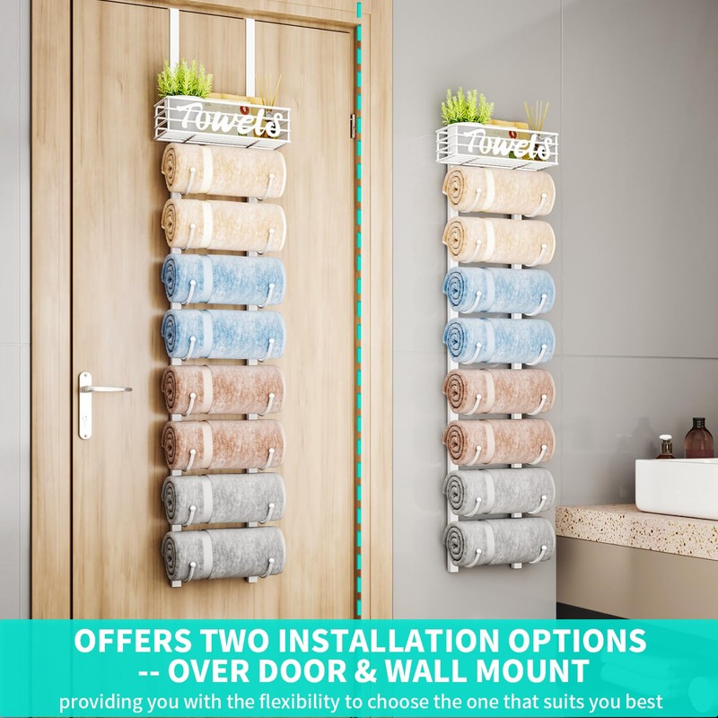 - [Maximizing Space]: This bathroom over the door towel rack utilizes unused space on doors and walls, adopting a vertical storage design that neatly organizes towels within limited space, making them easily accessible. Our towel rack can hold 8 towels, including a basket, a total of 9 tier