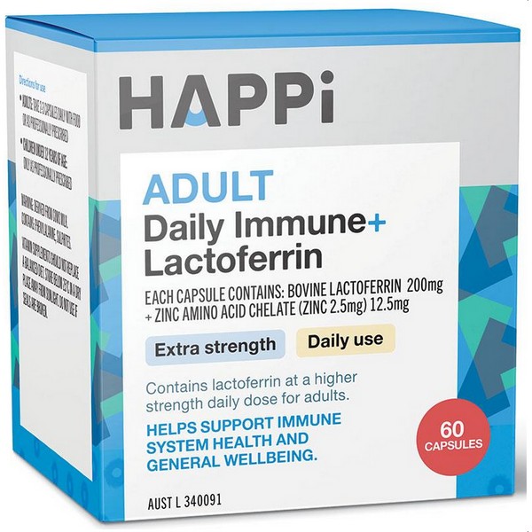 HAPPi Adult Daily Immune+ Lactoferrin helps support the health and function of the immune system, the body's natural defence mechanism, with a combination of two key nutrients. This daily formulation contains lactoferrin at a higher strength daily dose for adults and the essential trace mineral zinc.