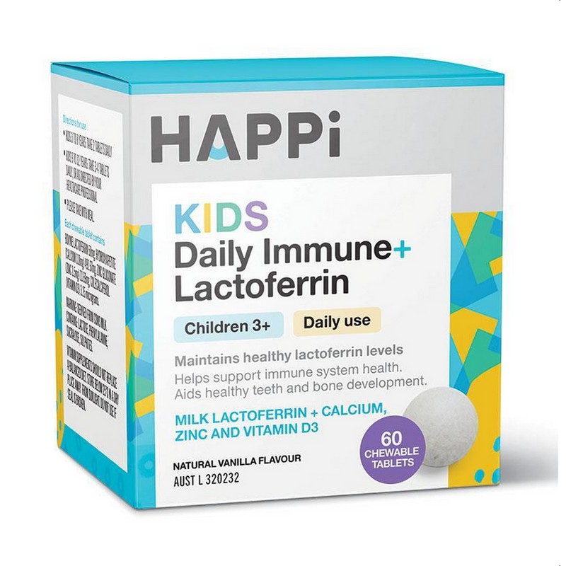 Happi Kids Daily Immune + Lactoferrin is a vanilla flavoured chewable tablet containing the essential nutrient Zinc and Milk Lactoferrin to support the health and function of a child's immune system. Plus the added benefit of Vitamin D and Calcium to support healthy growth and development. A specifically formulated combination for growing kids, Happi Kids Daily Immune + Lactoferrin helps to: