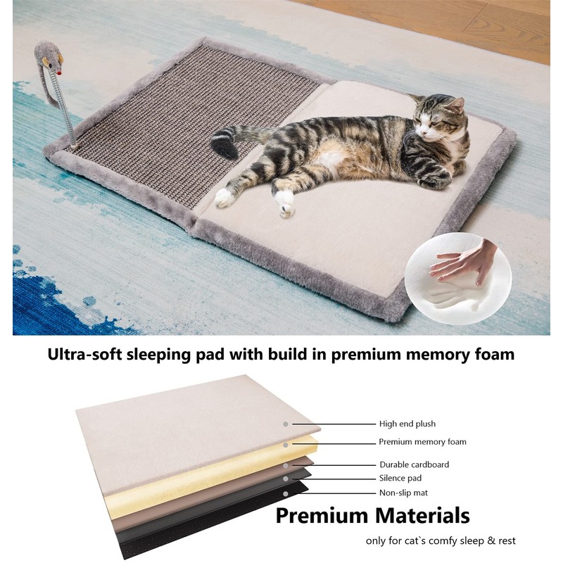 - Multi-function: unlike other products only use for scratching, our scratching pad is truly multiple-use for your kitty. Equipped with nature sisal scratch mats & ultra soft sleeping pad and an interactive toy, kittens will enjoy complete scratch, sleep, play in one area, and effectively protect your furniture from cat`s claws.