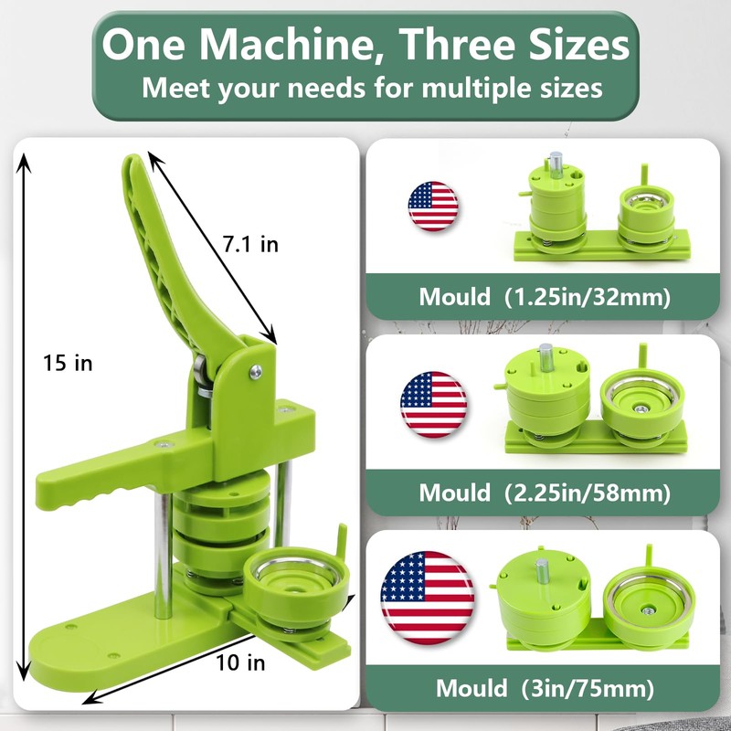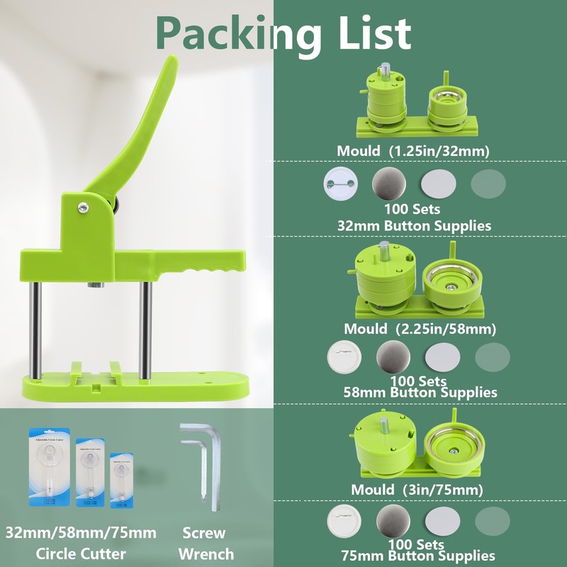 - 🎁DIY Button Maker Multiple Sizes Kit Includes - 1 × detachable buton badge maker machine, 3 × 32/58/75mm (1.25/2.25/3 in) button-models, 3 × circle cutter, 100 sets 32mm button parts, 100 sets 58mm button parts and 100 sets 75mm button parts (include: mylars & round blank paper).