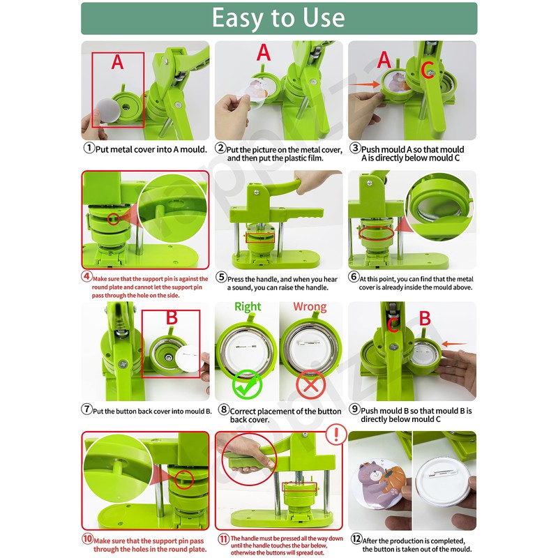 - 🎁Easy to Assemble and Use - It only takes 2 steps to assemble the button maker machine, and it is even easier to make badge buttons. We provide you with an instruction manual, even a beginner can easily master the use of the button pin maker within 2 minutes.