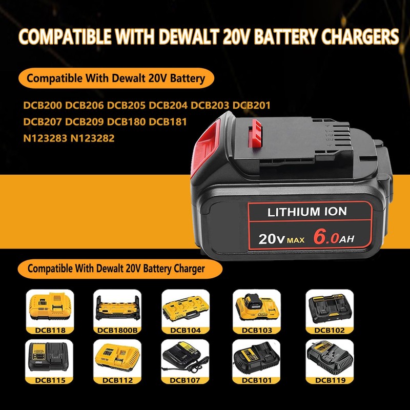 - 🔋【Superior Compatibility】100% replace for Dewalt 20v max battery model DCB200 DCB205 DCB206 DCB203 DCB204 DCB209 DCB207 DCB181 DCB180, compatible with Dewalt 20v cordless power tools and chargers (include DCD/DCF/DCG/DCS series tool DCB115 DCB118 DCB102 charger model)