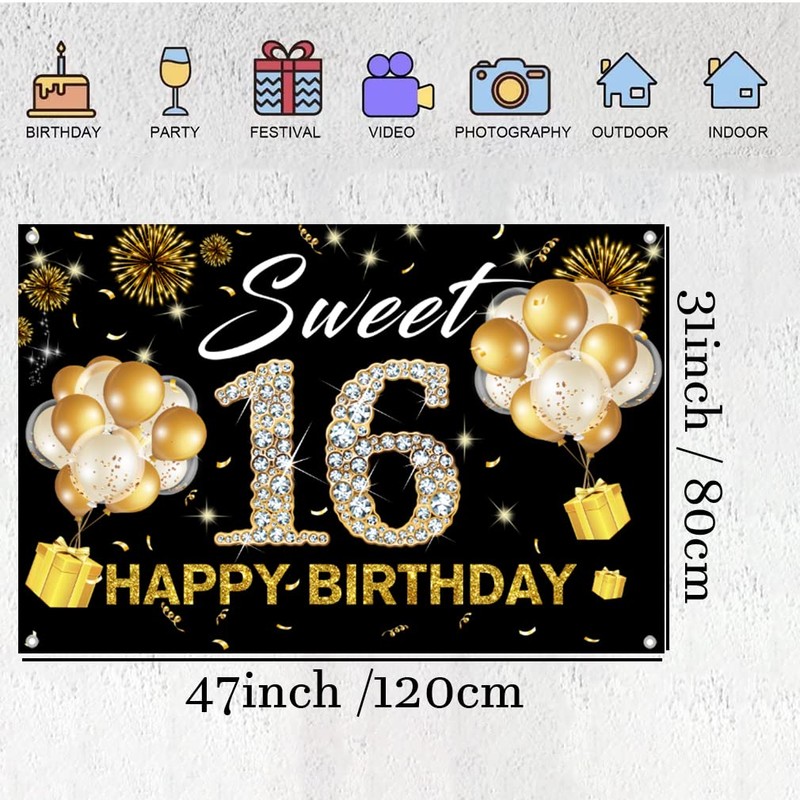 Happy 16th Birthday Backdrop Banner for Girl Sweet 16 Fabric Sign Poster Party Decoration, Black and Gold Photography Background 16th Birthday Party Supplies, 120x80cm