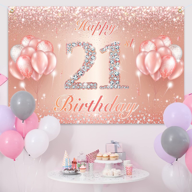 Happy 21st Birthday Banner Backdrop - 21 Birthday Party Decorations Supplies for Women or Men - Rose Gold 4 x 6ft