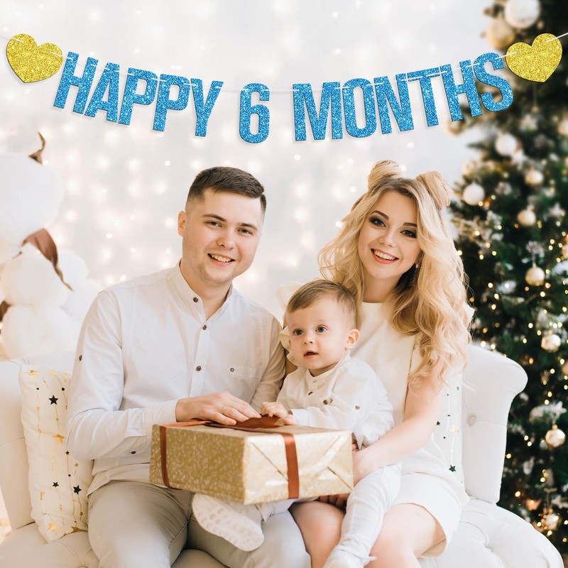 Happy 6 Months Banner, Half Way to One, Baby 1/2 Birthday, First Birthday Baby Shower Gender Reveal Party Decorations Supplies for Boy Girl, Blue Glitter