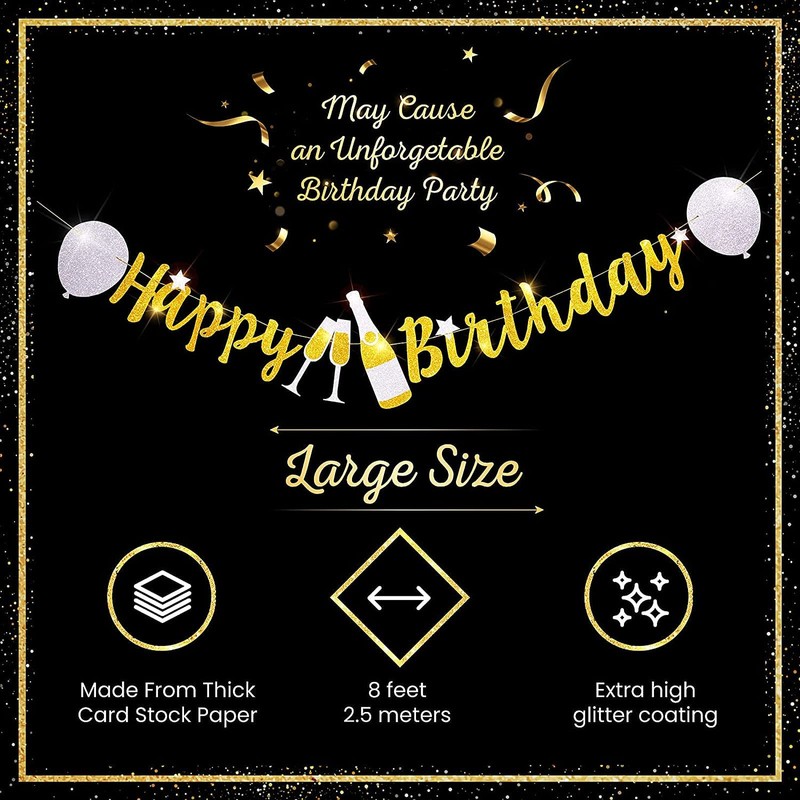 Happy Birthday Banner,Gold Glitter Birthday Party Signs with Balloons and Wine Cup for Birthday Party Supplies Sparkle Decorations