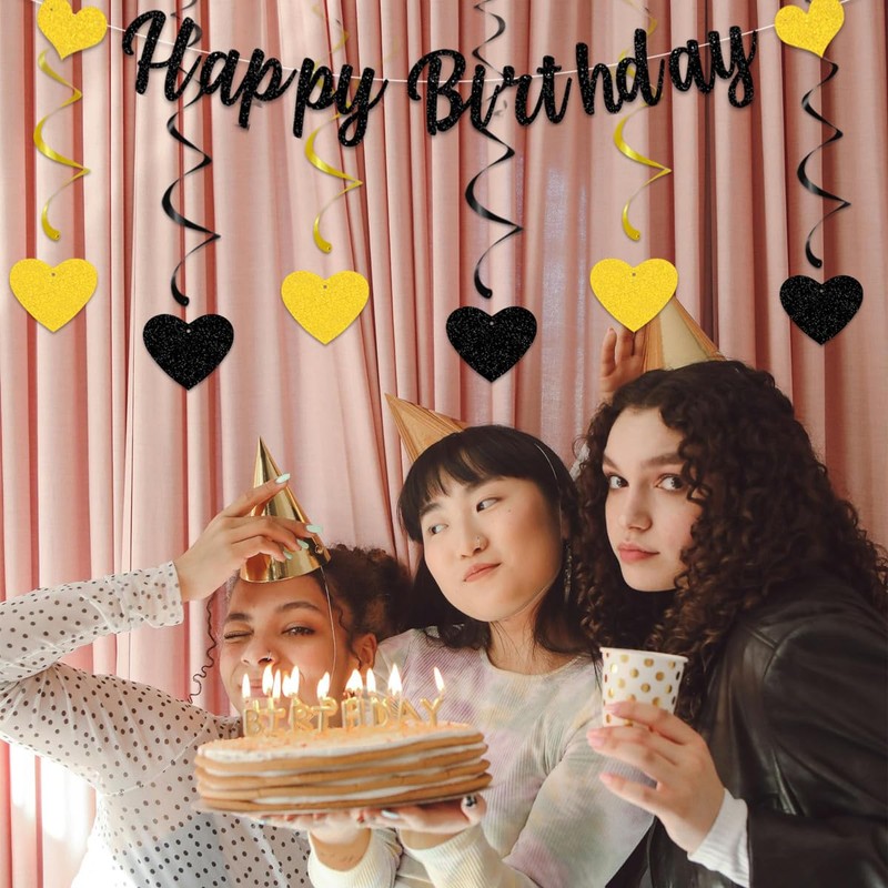 - Included: Happy Birthday banner in black,6 x Hanging Swirl Sweet Heart in black gold, Perfect for Birthday Party Decorations.