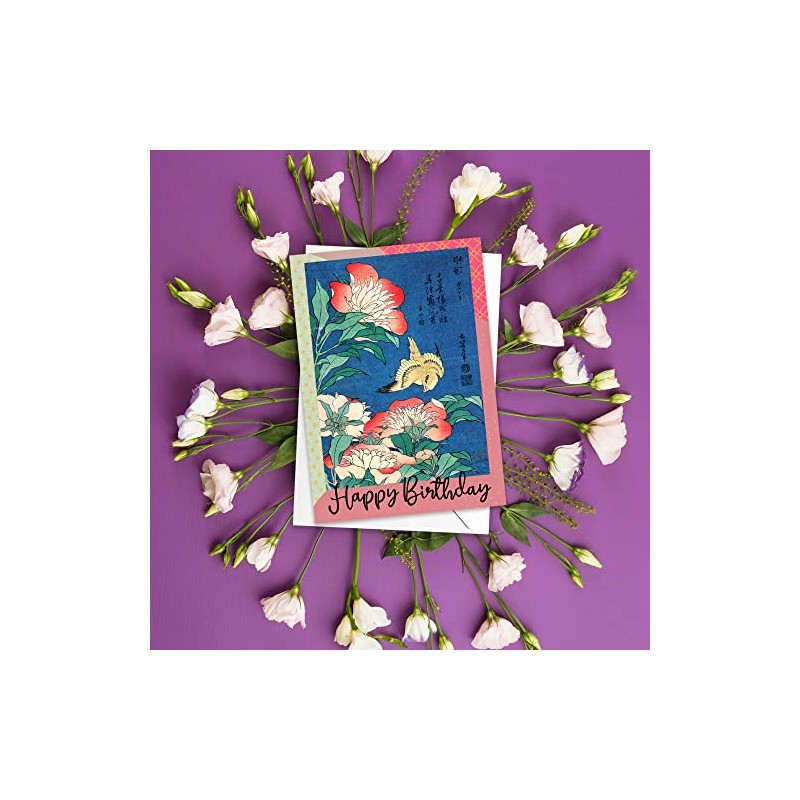 Happy Birthday Greeting Cards - Japanese Ukiyo-e Wood Block Print Art Card with Envelope (Hokusai Peonies and Canaries) - Code P12