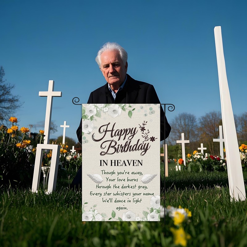 - 【Double Sided Flag & Touching Words】The happy birthday in heaven garden flag is double sided with the image printed and visible from both sides and text also reads correctly from both sides. these funeral flags printed with touching sentences:Though you're away,Your love burns through the darkest gray. Every star whispers your name We'll dance in light again.