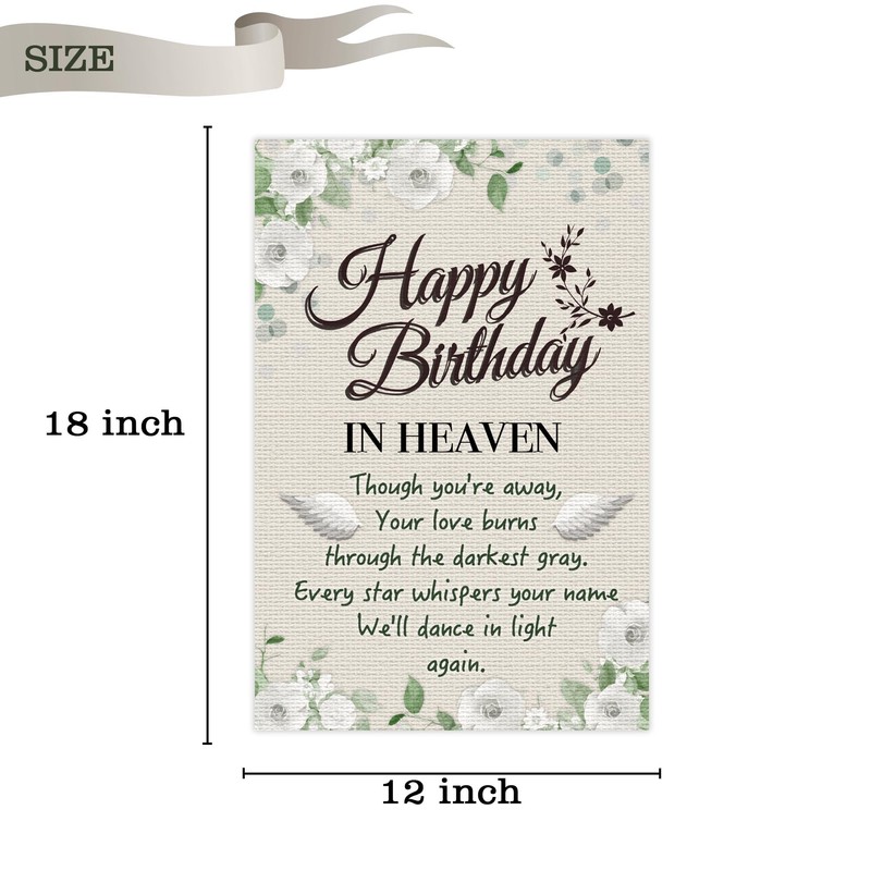 - 【Premium Quality Burlap Material】Our happy birthday in heaven garden flags are made of machine washable burlap and double stitched to improved durability. No matter what the weather, our yard sign can withstand any amount of rain, snow, pollen or harsh sunlight.