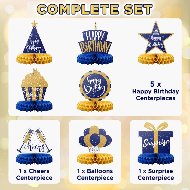 Happy Birthday Table Decoration Centerpieces - (8 Pack, Blue & Gold) - Double-Sided Happy Birthday Centerpieces for Tables - Party Supplies for Elegant Birthday Decorations by PixiPy