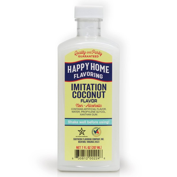 - HAPPY HOME IMITATION COCONUT FLAVORING – Add a tropical flavor to your recipes with Happy Home’s non-alcoholic Imitation Coconut Flavor in 7 oz. bottle. This clear flavor adds a delicious coconut taste without tinting your icing or cake.