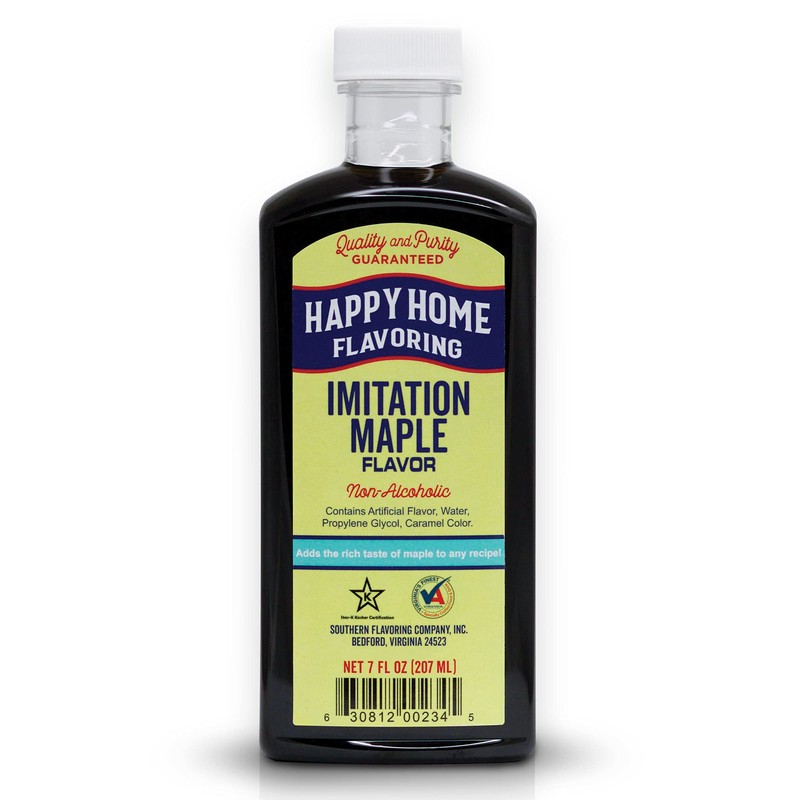 - Happy Home Imitation Maple Flavoring - This non-alcoholic imitation maple flavor in 7 oz. bottle simulates the flavor of real maple syrup but at a more affordable cost.