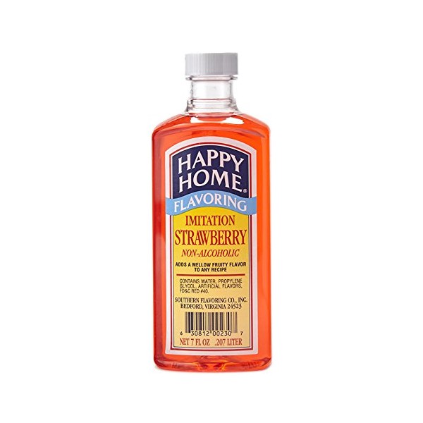 - HAPPY HOME IMITATION STRAWBERRY FLAVORING - Non-alcoholic imitation strawberry flavoring in 7 oz. bottle.