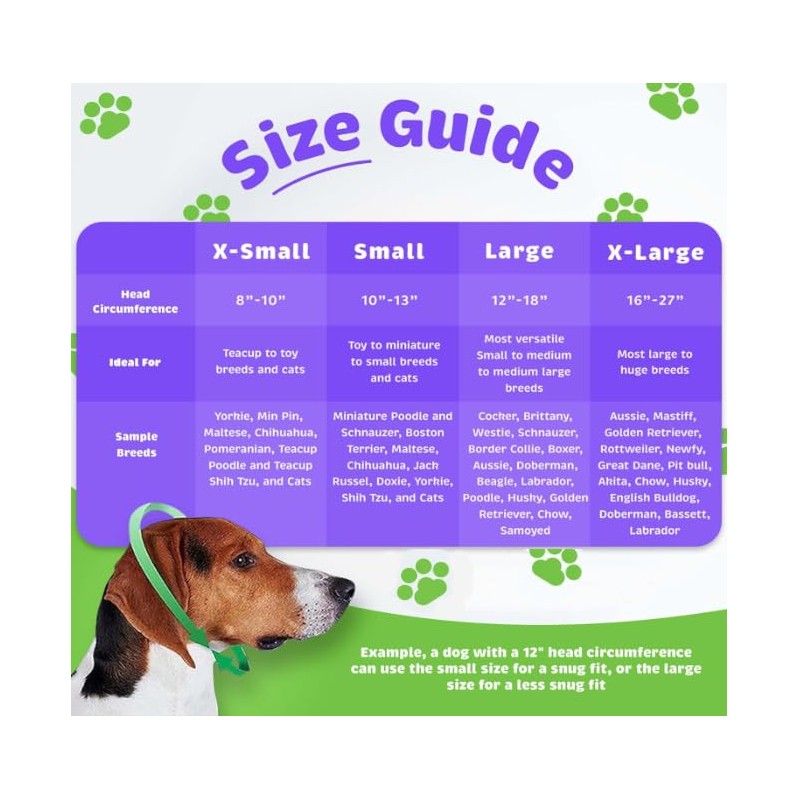 For a loose fit, choose a larger size Happy Hoodie dog head wrap for your dog's head size.