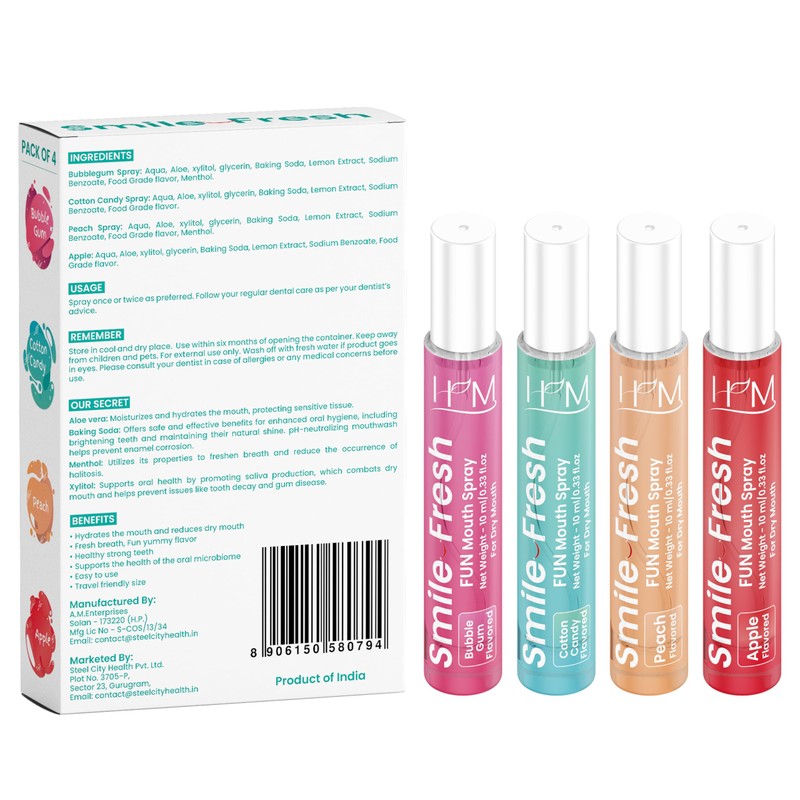 - VARIETY OF REFRESHING FLAVORS: The HM Dry Mouth Fun Flavored Spray comes in a pack of 4, featuring unique and delightful flavors C Buble Gum, Cotton Candy, Peach, and Apple. This variety allows users to enjoy a different taste experience each time they use the spray.