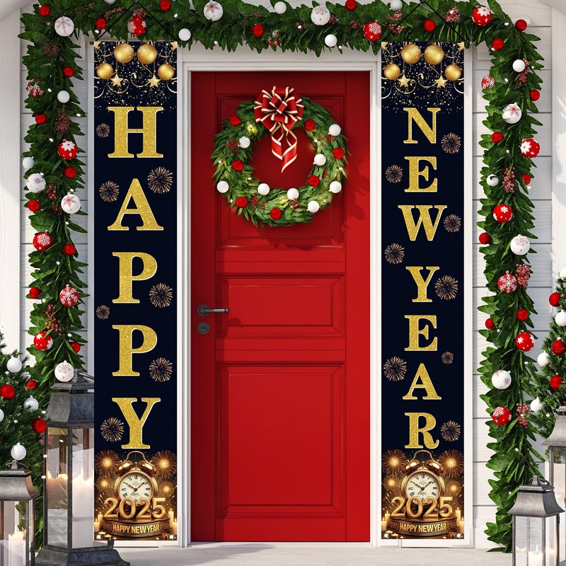 Happy New Year 2025 Banner Black Gold Clock Countdown Fireworks Front Porch Welcome Sign Happy New Year Party Decorations-12×71''