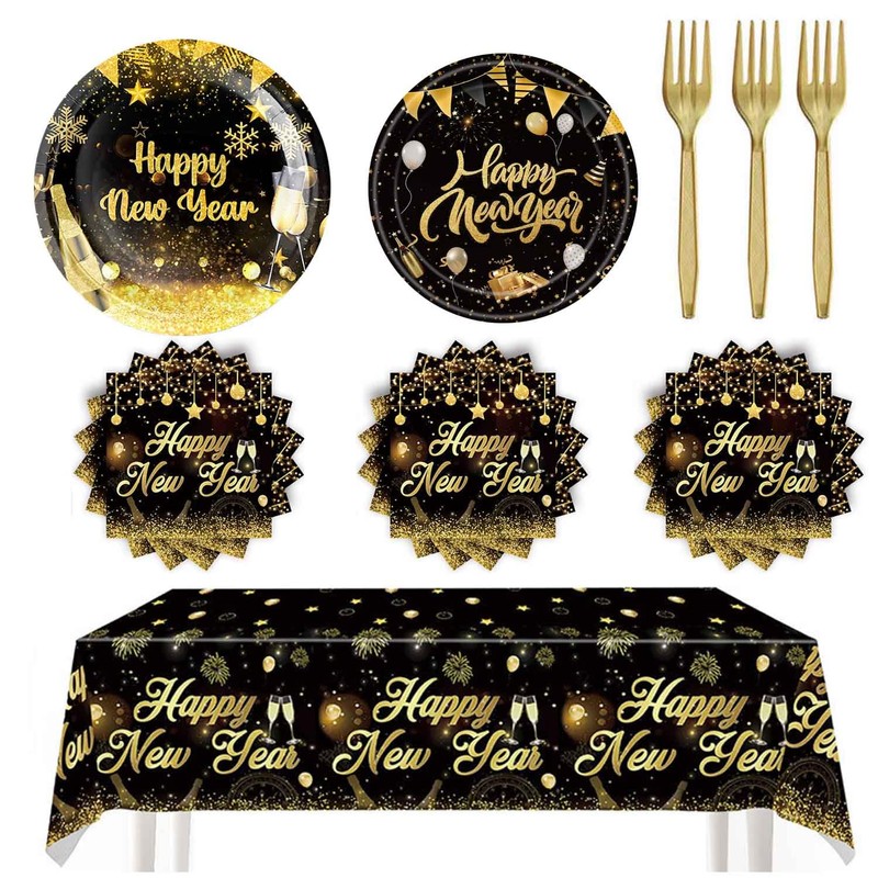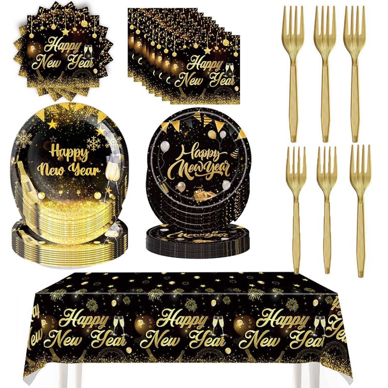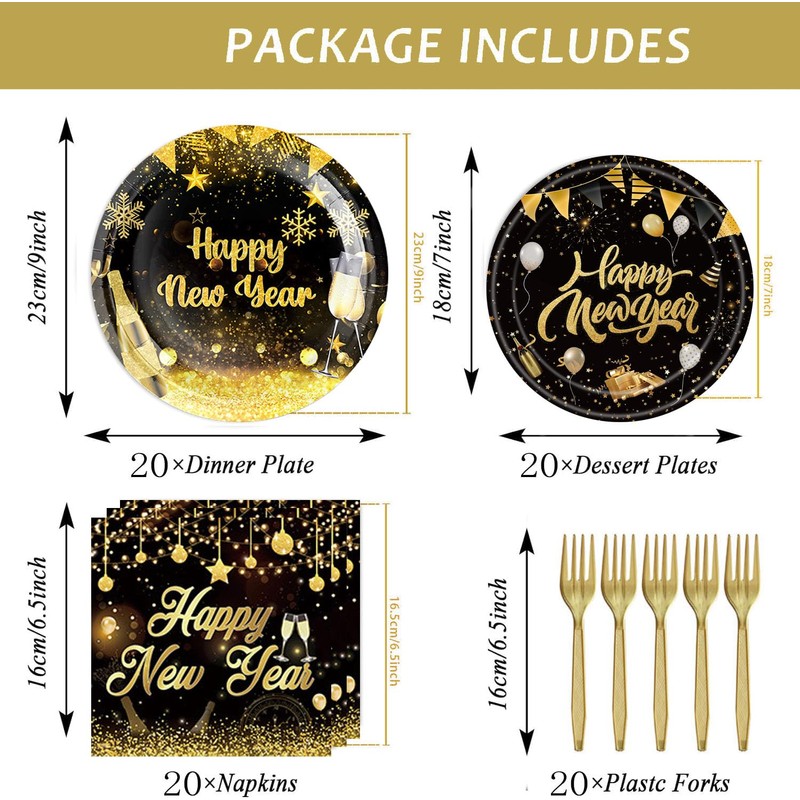 - Happy New Year Party Supplies Set for 20 Guests:This disposable tableware set includes everything you need for a perfect dining experience. It includes 20 sets of 9 inch paper dinner plates, 7 inch dessert paper plates, 6.5" napkins and 6.9" forks,(1x) topper Tablecloth