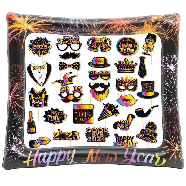 - Happy New Year Photo Booth Props with Inflatable Photo Frame New Year Party Photo Booth Props 2025 New Years Eve Party Supplies, 30 Pcs Props+1 Frame
