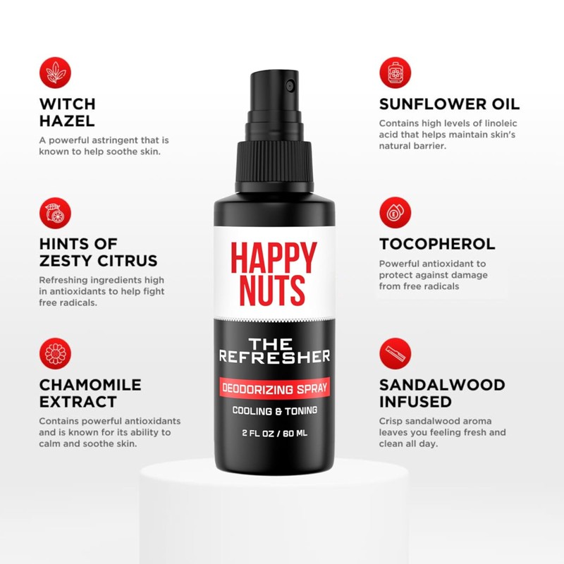 - ODOR NEUTRALIZER - Keep your private parts feeling fresh, clean, and comfortable with Happy Nuts nut spray for men. This odor neutralizing spray is perfect for after trimming, shaving, or cleansing. It's not just about deodorizing, this sack spray also provides a soothing and toning effect.