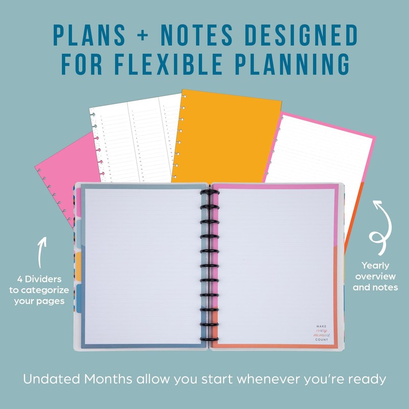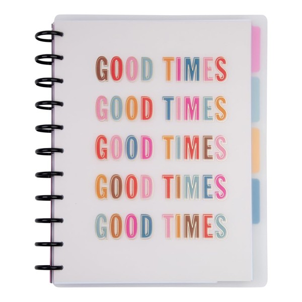 - HAPPY PLANNER UNDATED PLANNER: Our Good Going Magic–themed Plans + Notes 12-month notebook planner has undated calendar pages, yearly overview pages, and 68 front-and-back lined note pages. This Big-size planner measures 8 1/2" x 11", includes 95 total pages, and features a plastic cover with colorful letters that repeat the phrase “Good Times.”