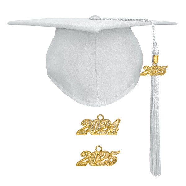 - What You Get:1 matte graduation cap + 1 color matched graduation tassel + 2 gold graduation year charms 2024+2025(If the year charm is missing,please let us know)