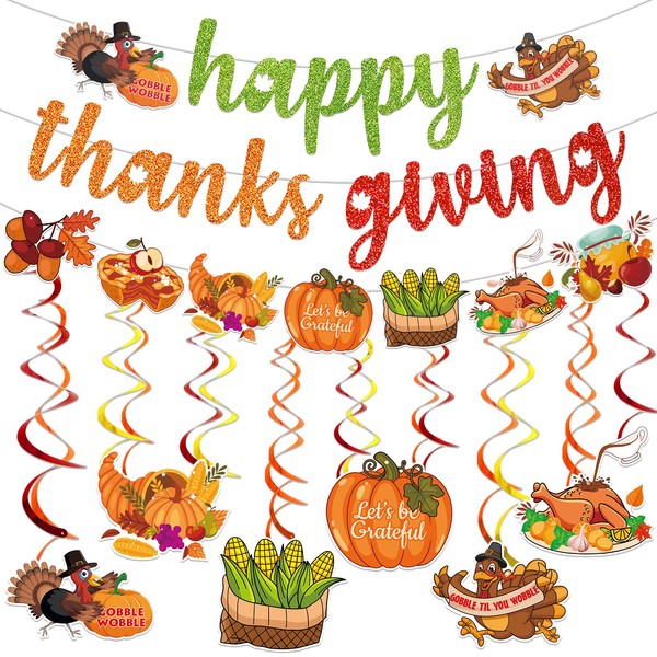 - Package include:1 Happy thanksgiving banner, 1 thanksgiving themed garland banner, 6pcs thanksgiving themed cutouts with hanging swirls. Each garland banner decoration size is about 6.5 feet perfect for Thanksgiving decor.