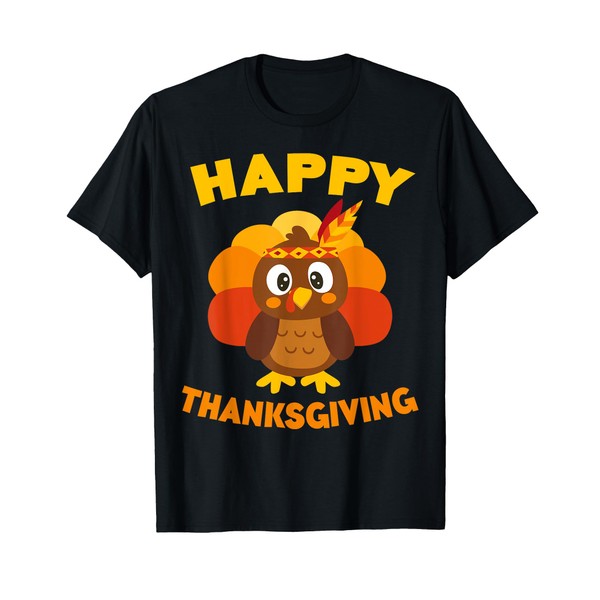 - Cute Happy Thanksgiving Tea Complete your collection of Harvest Festival party accessories for him and her (decorations, gobble matching outfit, pilgrim's face costume, cup, banner, trot hat, headband, disguise, onesie, face mask, tie, pin) with this t-shirt