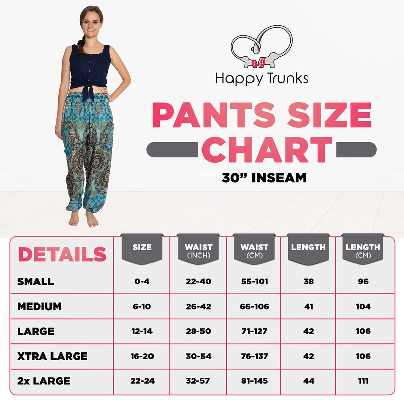 - PERFECT FITTING LOOSE PANTS FOR ALL:- Our wide legged hippie pants come in 5 sizes from S all the way to XXL, making them ideal for petite and plus size women alike. The loose and comfortable fit also makes them ideal maternity pants or workout pants and they are also unisex enough to be used as men’s harem pants.