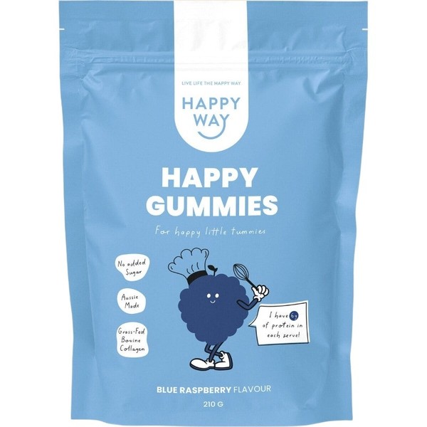 Made with 100% natural ingredients and enriched with our protein-collagen blend, Happy Way Happy Gummies Powder Blue Raspberry helps support energy, focus, and happy, healthy tummies.