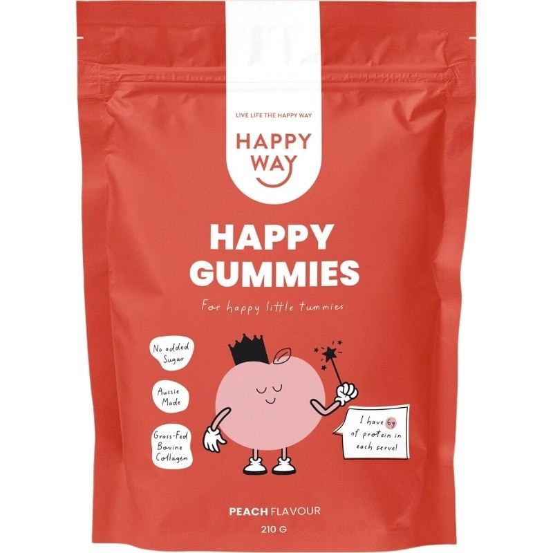 Made with 100% natural ingredients and packed with a protein-collagen blend, Happy Way Happy Gummies Powder Peach supports energy, focus and happy, healthy tummies.