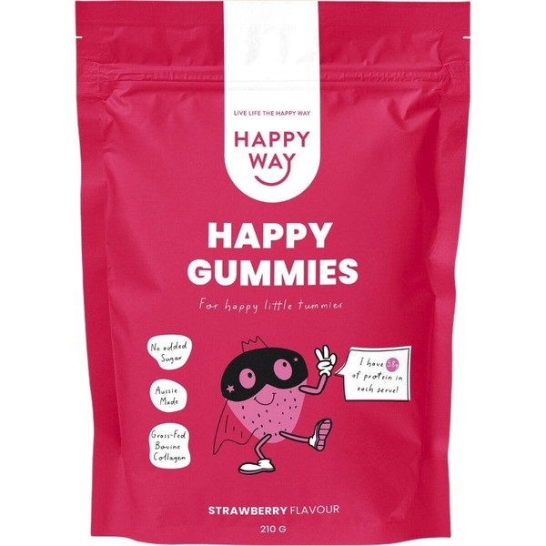 Made with 100% natural ingredients and enriched with our protein-collagen blend, Happy Way Happy Gummies Powder Strawberry helps support energy, focus, and happy, healthy tummies.