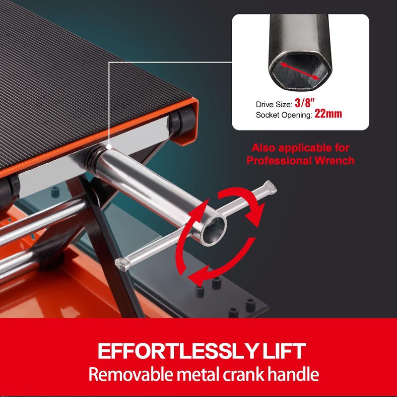 - High Weight Capacity:The Happybuy Motorcycle Scissor Lift Jack supports up to 1100 lbs (0.5 tons), making it ideal for lifting street bikes, cruiser bikes, and adventure touring motorcycles.