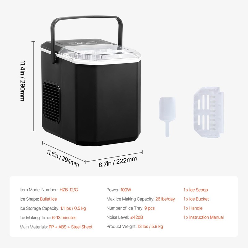 - Portable and Quiet Operation: The Happybuy countertop ice maker is compact, sized at 8.7 x 11.6 x 11.4 inches / 222 x 294 x 290 mm with a convenient handle, allowing for easy portability around your home, office, or even to a restaurant. It operates quietly, at a noise level below 42 dB, just like a working refrigerator, so it won't disturb your activities.
