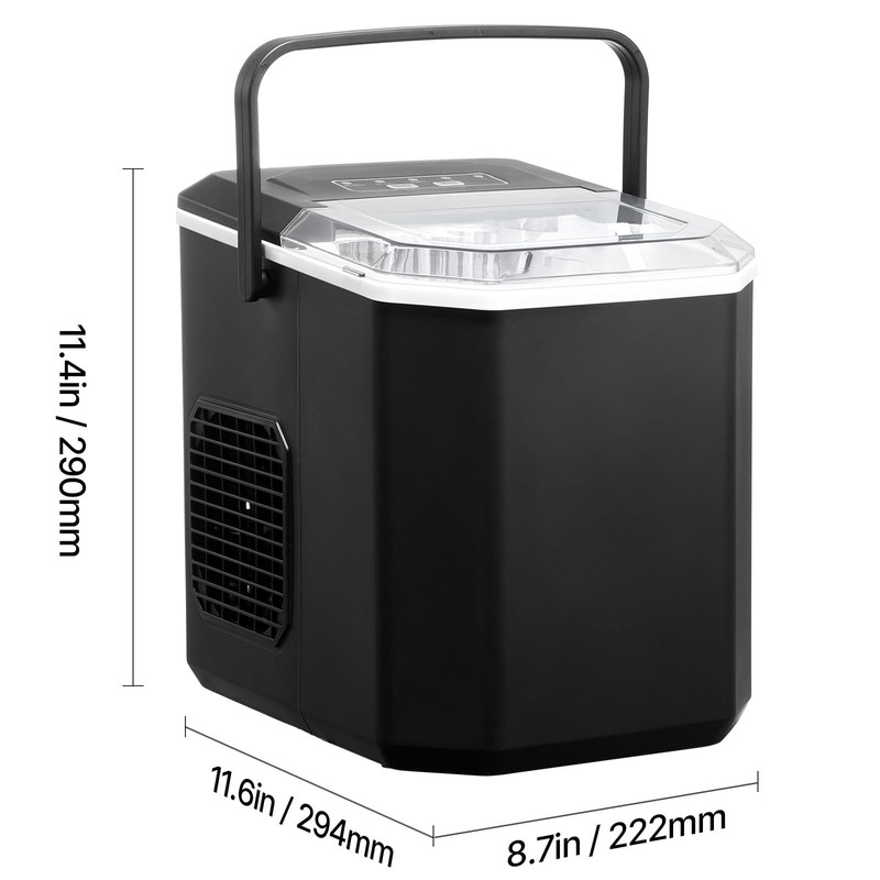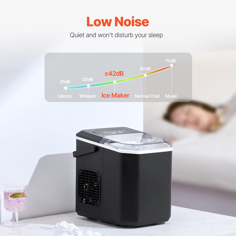 - Portable and Quiet Operation: The Happybuy countertop ice maker is compact, sized at 8.7 x 11.6 x 11.4 inches / 222 x 294 x 290 mm with a convenient handle, allowing for easy portability around your home, office, or even to a restaurant. It operates quietly, at a noise level below 42 dB, just like a working refrigerator, so it won't disturb your activities.