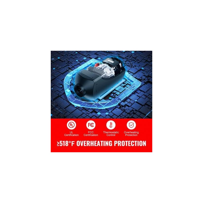 • Secure and Reliable: Our diesel air heater features a high safety system, allowing for worry-free usage in various environments such as cars, RVs, and ships. It provides constant temperature control, timing function, voice broadcasting, preheating, and overheating protection at ≥270 °C/518 °F, ensuring a safe and comfortable experience throughout the night.