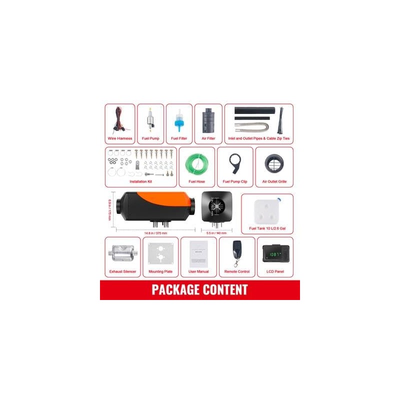 • Efficient Heating: Heater Power: 8 KW; Rated Voltage: 12V. Applicable Range: 215-269 ft²/20-25 m². Our diesel air heater adopts a sandblasting aluminum heat exchanger for rapid heat production and transfer, ensuring a comfortable temperature inside your vehicle or boat within 10 minutes.
