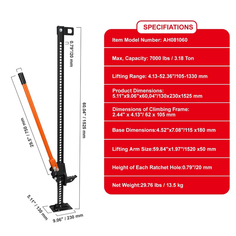 Happybuy Durable Farm Jack, 60" Versatile Jack, 7000 lbs Capacity Ratcheting Off-Road Jack, Sturdy Utility Jack for Tractors, Trucks, SUVs and Bumper Lifting, Orange