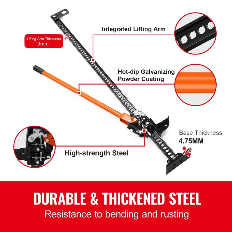 - Durable Construction Crafted with integrated casting and stamping steel parts, this farm jack is extremely reliable. The strong material prevents bending, and the hot-dip galvanized powder spraying process protects against rust. Regular cleaning and applying rust-resistant oil after use can extend its lifespan.