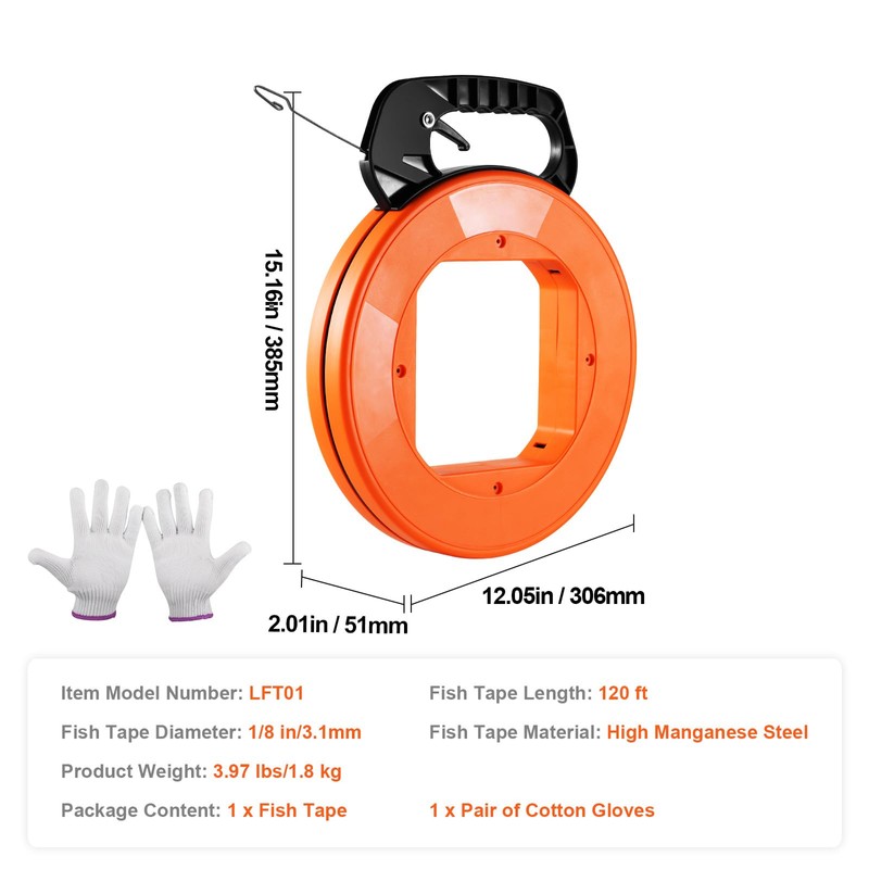 - Premium Wire Material: This fish tape is made of high-manganese steel. It's 120 feet long and 1/8 inch in diameter, handling 90° bends easily and being highly wear-resistant and stretch-resistant.