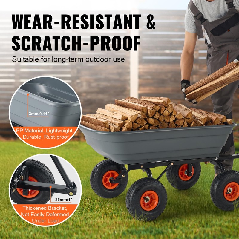 - Secure and Safe Transport: The included mesh cover and cushion provide added safety for your items during transit. This yard dump cart is versatile enough for use in various environments, including gardens, orchards, farms, and warehouses, effectively handling all your transporting needs.