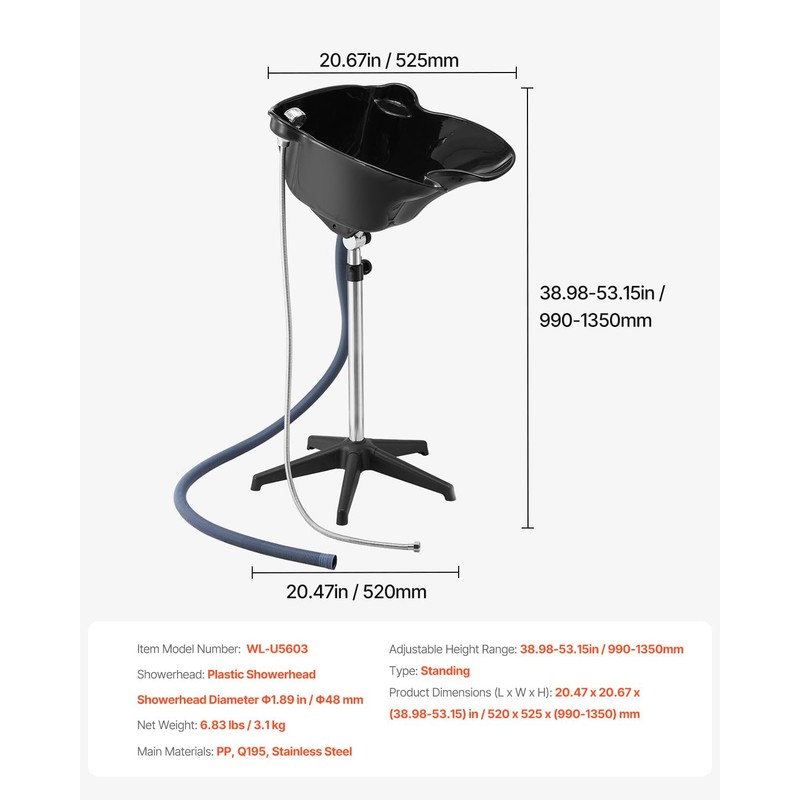 - Comfortable Use: This shampoo sink is designed to fit the neck curve. Its height can be adjusted from 37.8 to 52.36 in/96 to 133 cm, and the angle can be changed up to 270° forward and backward. Whether sitting or reclining, you can adjust it easily for maximum comfort. The edges are rolled for extra comfort, and along with the showerhead, it guarantees a delightful washing experience.