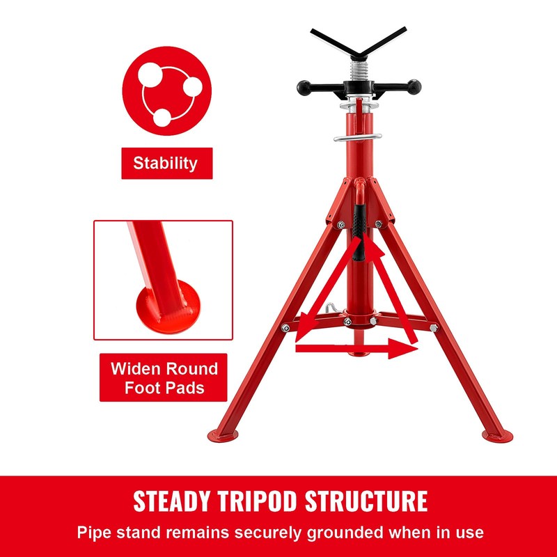 - Heavy Duty V-Head: The pipe stand features a durable V-head, suitable for pipe sizes from 1/8 to 12 inches (0.32 to 30.48 cm). The steel structure is highly durable, resistant to rust and corrosion, and can lift up to 2500lbs/1134kg.