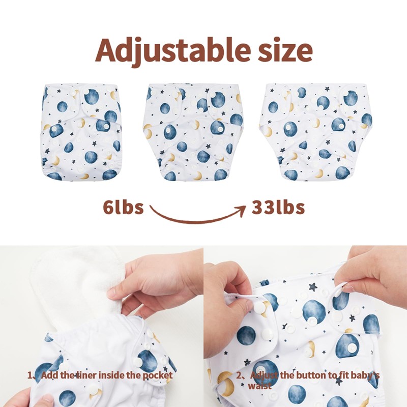 - ADJUSTABLE & COMFORTABLE - These cloth diapers are designed to fit newborns from 3-15kg(6-33 pounds)and are adjustable to grow with your baby. The snug leg openings and waterproof cover provide a leak-proof fit, while the soft polyester fabric with waterproof and breathable TPU ensures your baby stays comfortable.