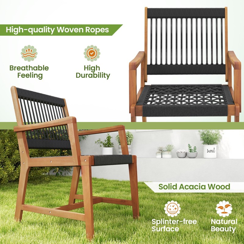 Featuring long-lasting hand-woven ropes that provide a breathable and comfy seating experience, these outside chairs also boast an impressive 360 lbs weight capacity thanks to their solid acacia wood construction. Designed with a 105° ergonomic tilt and comfortable armrests, each patio dining chair offers the ultimate relaxation, perfectly fitting your porch, balcony, garden or backyard. The stylish blend of natural acacia and chic black ropes not only enhances the durability but also adds a modern touch to your outdoor ambiance, making these chairs a versatile choice for different settings.