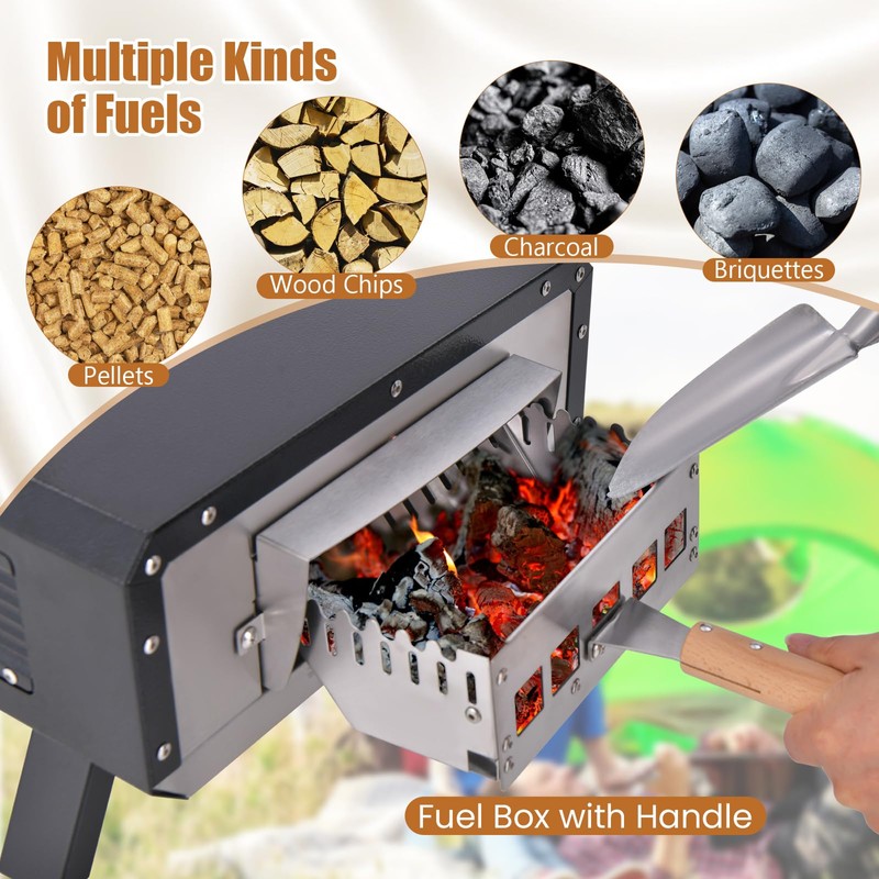 - Suit Multiple Kinds of Fuels & Foods: Versatility at its finest, the multi-fuel pizza maker comes with a fuel box with handle, accommodating pellets, wood chips, charcoal, and briquettes. It's not just for pizzas; this pizza oven is your companion for a wide array of mouthwatering foods, perfect for any outdoor feast.