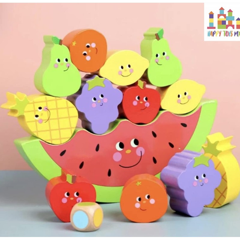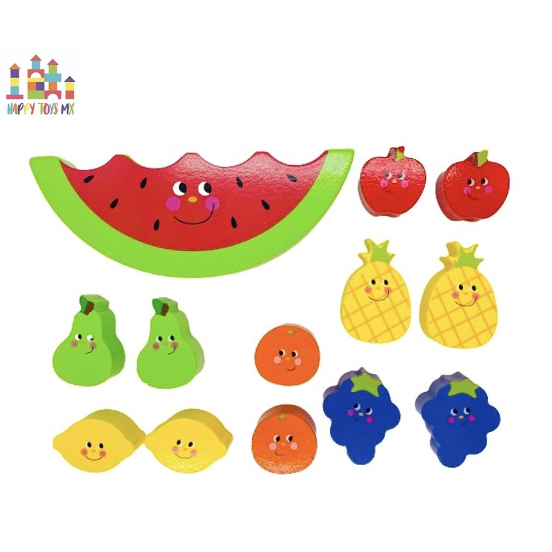 - SANDIA DE EQUILIBRIO: Base con forma de sandia, multiples figuras de madera con forma de frutas para apilar, Incluye una bolsa ecologica de HappyToysMX para guardarlo y transportarlo. Muy resistente y seguro, sin piezas pequeñas o desarmables.